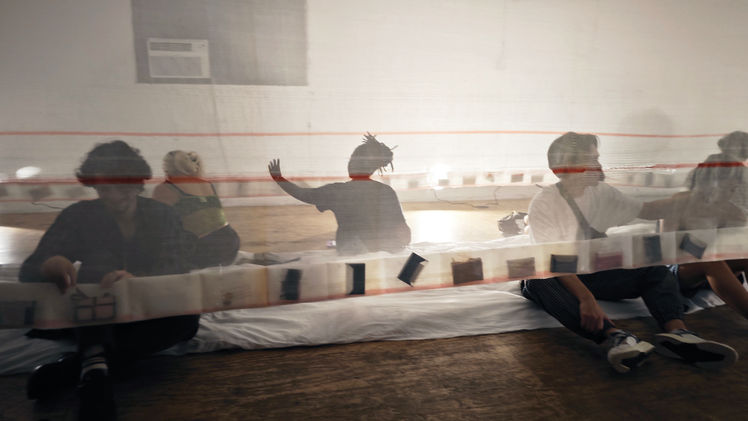 for telos.haus, matsuura has collaborated with architect abraham coriat to create a site-specific installation: a custom-sewn curtain of debris netting suspended from electrical conduit, bringing the industrial grit of east williamsburg inside while creating an intimate viewing environment at sitting height.